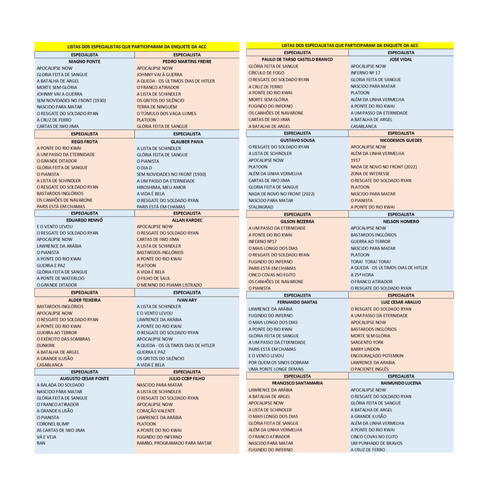 A Academia Cearense de Cinema promoveu uma enquete perguntando a 20 grandes especialistas no gênero de filmes de guerra, no cinema mundial: quais são os 10 maiores filmes de guerra de todos os tempos?